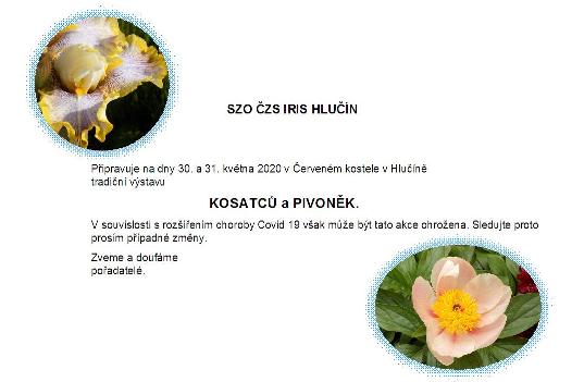 O týden později (5. a 6. června 2020) v Zahradnické střední škole Ostrava, u příležitosti dne otevřených dveří na školním statku v Nové Vsi, měla proběhnout další výstava kosatců a pivoněk.