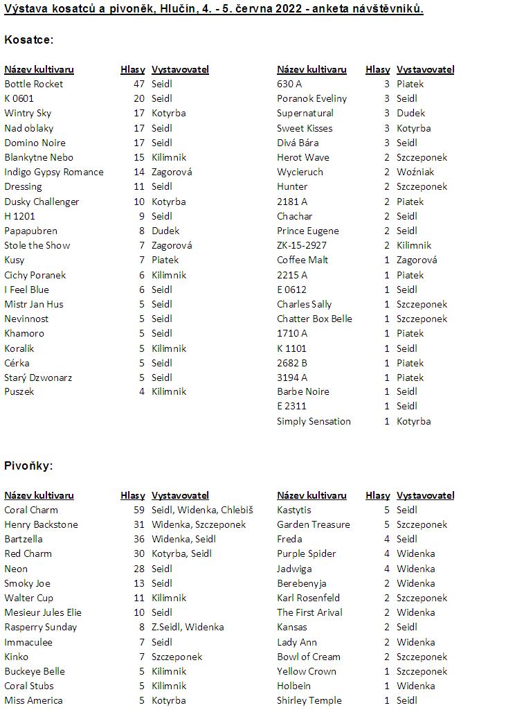 Kosatce vystavovalo 9 a pivoňky 6 místních a polských šlechtitelů a pěstitelů. Vystaveno bylo celkem cca 130 odrůd kosatců a 100 pivoněk. Vystaveny byly kosatce které týden před výstavou získaly ocenění na zahraničních mezinárodních soutěžích. 'Nad oblaky' (Zdeňka Seidla) v Paříži a 'Matka Theresa (Roberta Piatka) ve Florencii.