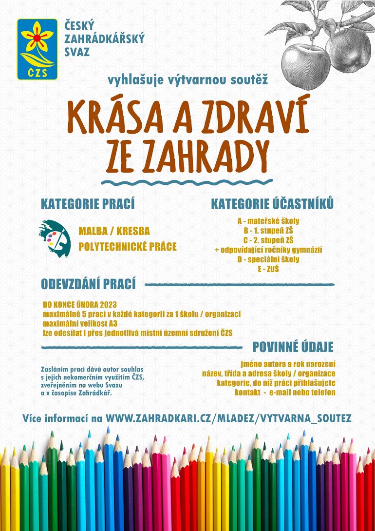 Zasláním díla do soutěže dáváte souhlas s jeho nekomerčním využitím v rámci ČZS, zveřejněním na webu ČZS, v časopisu Zahrádkář, ve Zpravodaji ČZS a na výstavách pořádaných ČZS nebo s účastí ČZS.