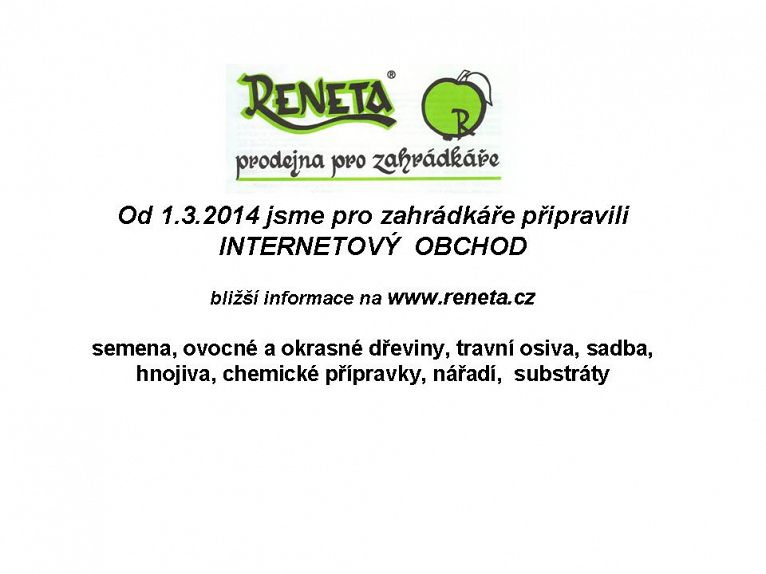 Nabídka služeb firmy RENETA, která sponzoruje školení zahrádkářských instruktorů, které probíhá v sále RCO u hl. vlakového nádraží v Olomouci: