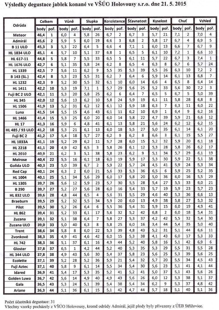 Dne 21. května 2015 se ve Výzkumném a šlechtitelském ústavu ovocnářském v Holovousech konala degustace jablek za účasti zástupců ZO ČZS Holice. U 44 odrůd byla hodnocena vůně, slupka, konzistence dužniny, šťavnatost, kyselost, vzhled a chuť. První místo obsadila odrůda Meteor. Ta se v degustacích často objevuje na předních místech, obdobně jako Admirál, který letos skončil jako druhý. Degustace se konala v prostorách moderního nově vybudovaného Ovocnářského výzkumného institutu.