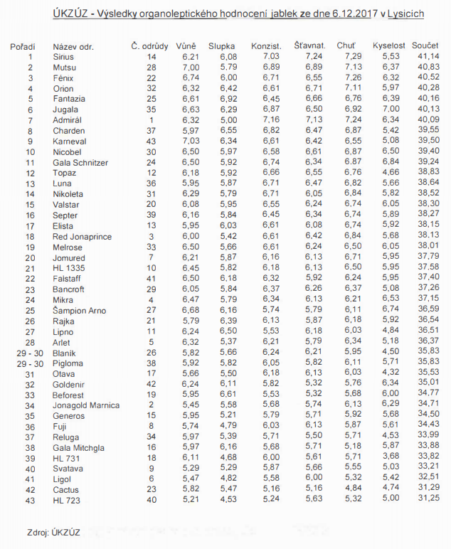 Dne 6. prosince 2017 proběhla v Lysicích tradiční degustace jablek, které se v letošním roce zúčastnilo přes 120 hodnotitelů z řad šlechtitelů, pěstitelů, školkařů a dalších významných specialistů oboru (věkový interval byl v rozmezí od 20 do 83 let). Hodnoceno bylo celkem 43 odrůd, z toho 40 zapsaných ve Státní odrůdové knize ČR a 3 odrůdy, které jsou v současné době ve zkouškách pro udělení ochranných práv.