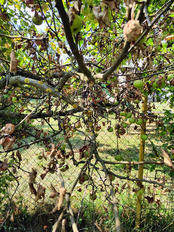 Na jabloni se asi před měsícem objevilo následující: na listech skvrny, začaly schnou listy, větve, plody "hnijí", na kmeni vážné poškození
