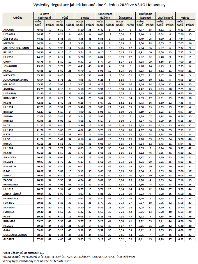 Ve čtvrtek 9. ledna 2020 se v jednacím sále VŠÚO Holovousy konala za účasti zástupců ZO ČZS Holice zimní degustace jablek. Degustace se zúčastnilo 117 hodnotitelů, kteří hodnotili 47 vzorků odrůd a novinek. Vzorky byly uskladněny v chladírně při teplotě 1-2 °C a jsou z VÝZKUMNÉHO A ŠLECHTITELSKÉHO ÚSTAVU OVOCNÁŘSKÉHO HOLOVOUSY s.r.o., a ÚEB Střížovice. Vítězem se stala odrůda ANGOLD.