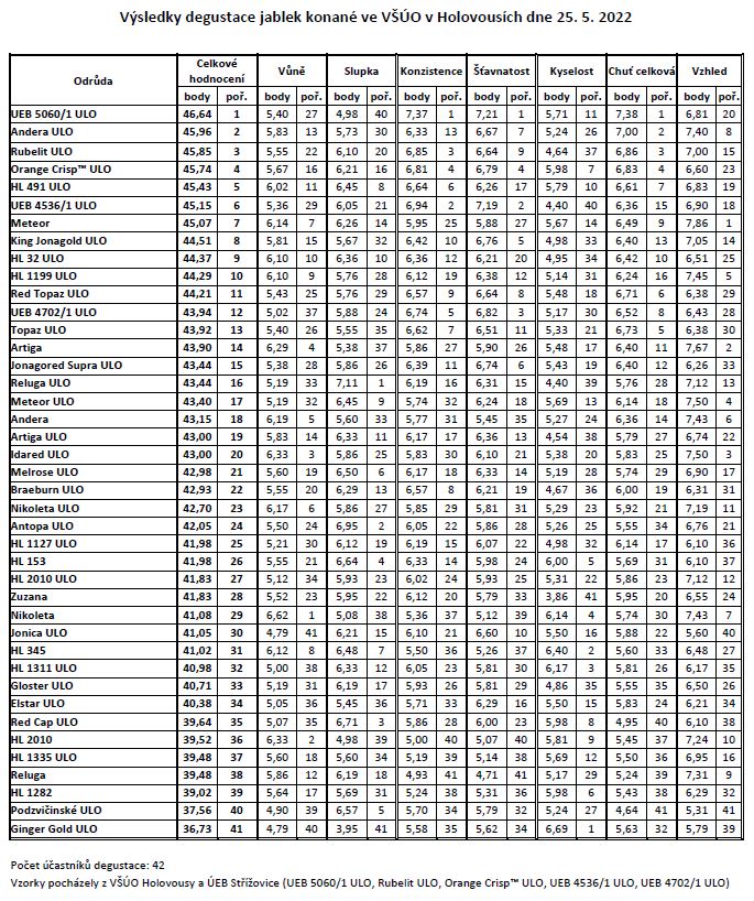 Dne 25. května 2022 se ve Výzkumném a šlechtitelském ústavu ovocnářském Holovousy konala degustace jablek za účasti zástupců ZO ČZS Holice. U 41 vzorků (z toho 11 z novošlechtění Holovousy a 3 z novošlechtění Střížovice) byla hodnocena vůně, slupka, konzistence dužniny, šťavnatost, kyselost, vzhled a chuť. Hodnocená jablka uskladněná v prostorách VŠUO se nacházela buď v chladírně s normální atmosférou (při 2 až 3°C) nebo pod ultranízkou kyslíkovou atmosférou (technologie ULO = ultra low oxygen; při 1°C a 2 % kyslíku a 1 % oxidu uhličitého). Zvítězila odrůda z novošlechtění ze Střížovic pod označením UEB 5060/1 skladovaná v podmínkách ULO. Pořadová čísla odrůd na fotografiích nezobrazují konečné výsledky, ale pouze pořadí, ve kterém byly degustovány. Brzy přineseme výsledky degustace.