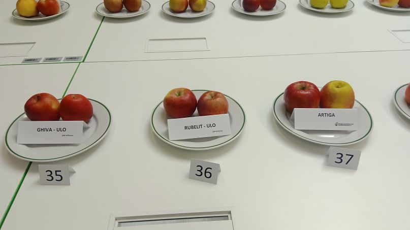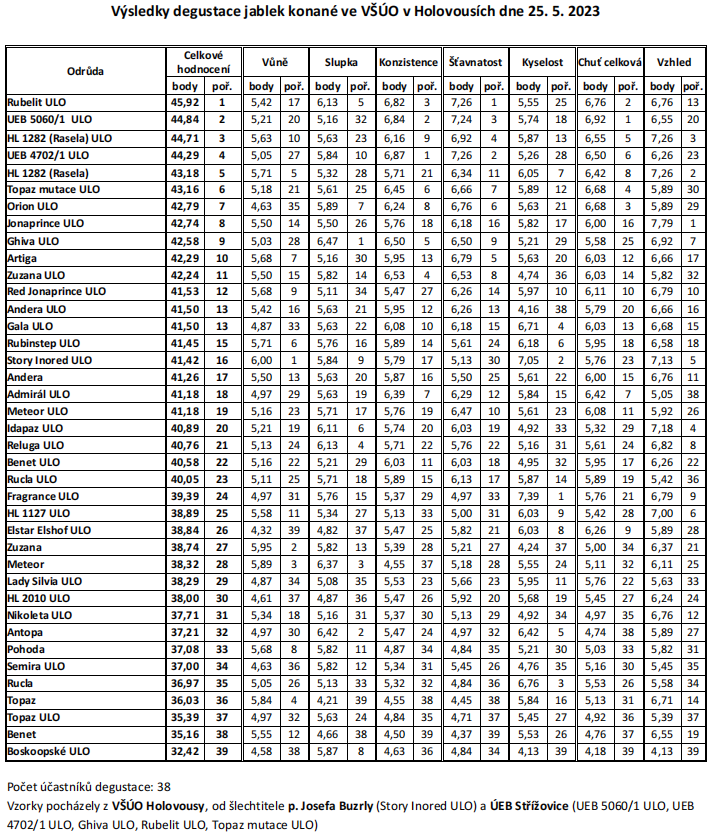 Dne 25. května 2023 se ve Výzkumném a šlechtitelském ústavu ovocnářském Holovousy konala degustace jablek za účasti zástupců ZO ČZS Holice. U 39 vzorků byla hodnocena vůně, slupka, konzistence dužniny, šťavnatost, kyselost, vzhled a chuť. Hodnocená jablka uskladněná v prostorách VŠUO se nacházela buď v chladírně s normální atmosférou (při 2 až 3°C) nebo pod ultranízkou kyslíkovou atmosférou (technologie ULO = ultra low oxygen; při 1°C a 2 % kyslíku a 1 % oxidu uhličitého). Zvítězila odrůda Rubelit skladovaná v podmínkách ULO. Pořadová čísla odrůd na fotografiích nezobrazují konečné výsledky, ale pouze pořadí, ve kterém byly degustovány.