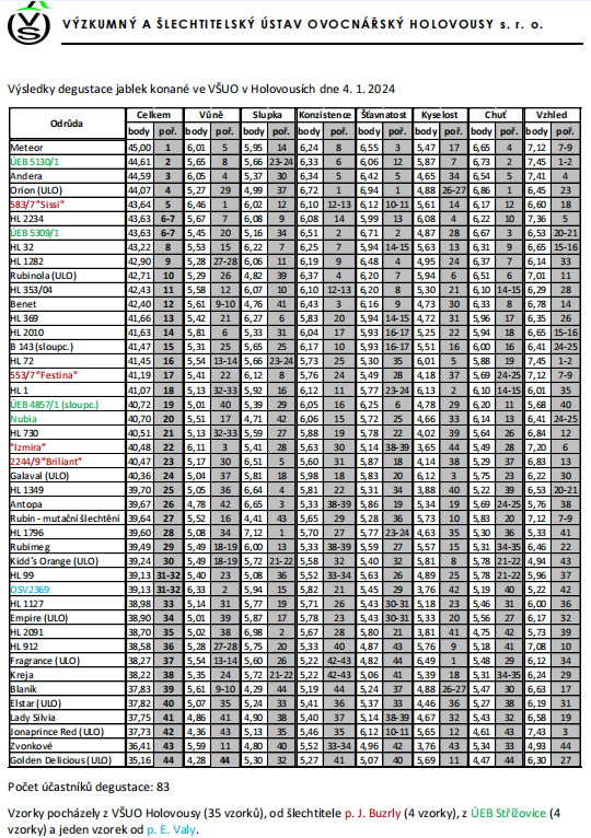 Ve Výzkumném a šlechtitelském ústavu ovocnářském Holovousy se 4. ledna 2024 konala tradiční již 55. degustace odrůd jablek. Výsledné bodové hodnocení bylo získáno součtem průměrného bodového hodnocení vůně, slupky, konzistence dužniny, šťavnatosti, vzhledu a dvojnásobného počtu bodů chuti. Kromě základního pořadí byly také sledovány změny v pořadí vzorků dle tří věkových kategorií hodnotitelů. Degustace jablek se zúčastnilo 83 hodnotitelů a bylo hodnoceno 44 vzorků vybraných odrůd z genofondů a novošlechtění jablek VŠUO i od soukromých šlechtitelů. Většina hodnocených vzorků byla skladována v běžné chladírně při teplotě + 2°C, ale zařazeno bylo také několik vzorků skladovaných v podmínkách ULO (atmosféře se sníženým obsahem kyslíku). Celkovým vítězem se stala odrůda Meteor. Ta obsadila první příčku také v podskupině hodnotitelů do 30 let (15 osob) i v kategorii 51letých a starších (45 osob). Mezi hodnotiteli ve věku 31 až 50 let (23 osob) zvítězila odrůda ÚEB 5130/1.