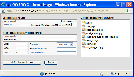 Pro vkládání obrázků v průběhu vytváření obsahu stránky můžete použít dialogové okno přímo v editoru textu. Tímto způsobem však lze obrázky pouze na server odesílat a následně vkládat do stránky. Obrázky však jsou uvedeny jen jako seznam podle názvu a nelze je v tomto dialogovém okně odstranit.