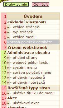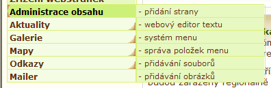 Při správě stránek pak další správce vidí v menu zeleně označené stránky, které může spravovat a červeně ty které nemá právo upravovat.