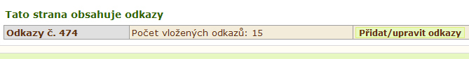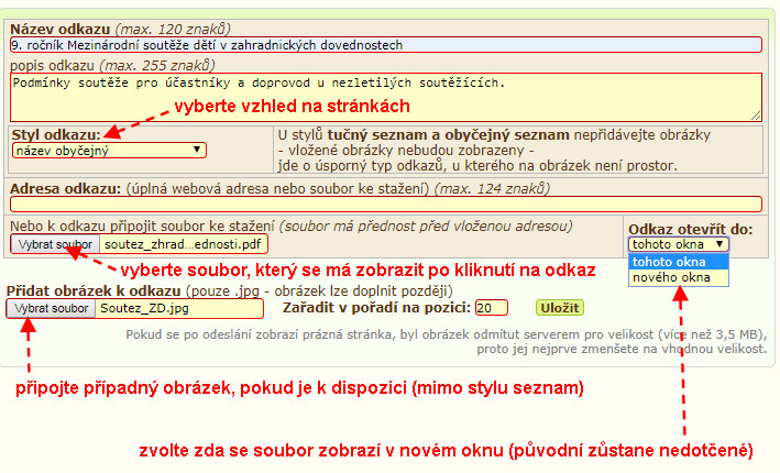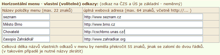 Vlastní odkazy: V hlavičce je možné kromě základních odkazů doplnit i vlastní odkazy na důležitá místa. Např. odkaz na webové stránky vašeho města / obce, na zájmová sdružení, se kterými spolupracujete. Jsou to v podstatě význačnější odkazy. Jako základní jsou zde nastaveny odkazy na ČZS a vaše ÚS, které nelze zrušit. U vlastních odkazů se zadávají dva údaje: název odkazu (např. Naše obec, a vlastní úplný odkaz např. http://www.seznam.cz, tak jak je uveden v řádce prohlížeče).