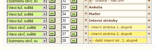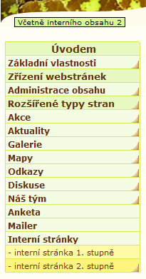 Interní stránky jsou barevně odlišeny v menu – jsou podbarveny světle žlutě pro první interní úroveň středně žlutě pro druhou úroveň.