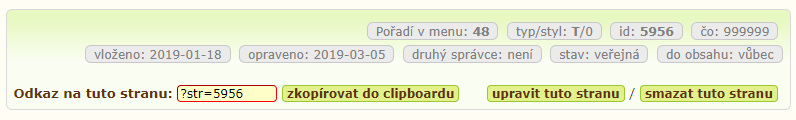 Červeně zobrazené součásti jsou základní prvky stránky (jsou na stránce vždy) a tvoří jakousi obálku pro vybranou součást strany - podle zvoleného typu. V případě zvolení jiného typu stránky než "Textová" se tato vlastnost zobrazí až po prvním uložení stránky, tedy při založení nové strany až po jejím přidání, u editované až po uložení změn.