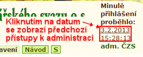 Do tabulky se zapíše čas, IP adresa počítače, který se přihlásil, a pokud bylo přihlášení úspěšné, pak i kdo se přihlásil - buď hlavni správce, nebo další správce pokud je pro stránky stanoven. V případě přihlášení správce ústředí najdete v seznamu záznam s - adm. ČZS