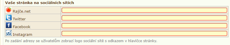 Nastavte cesty k vašim sociálním sítím pokud je používáte - Rajče, Twitter, Facebook, Instagram