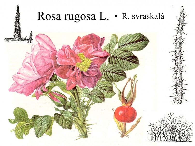 růže svrasklá nebo vráščitolistá, kvete od května do zámrazu.