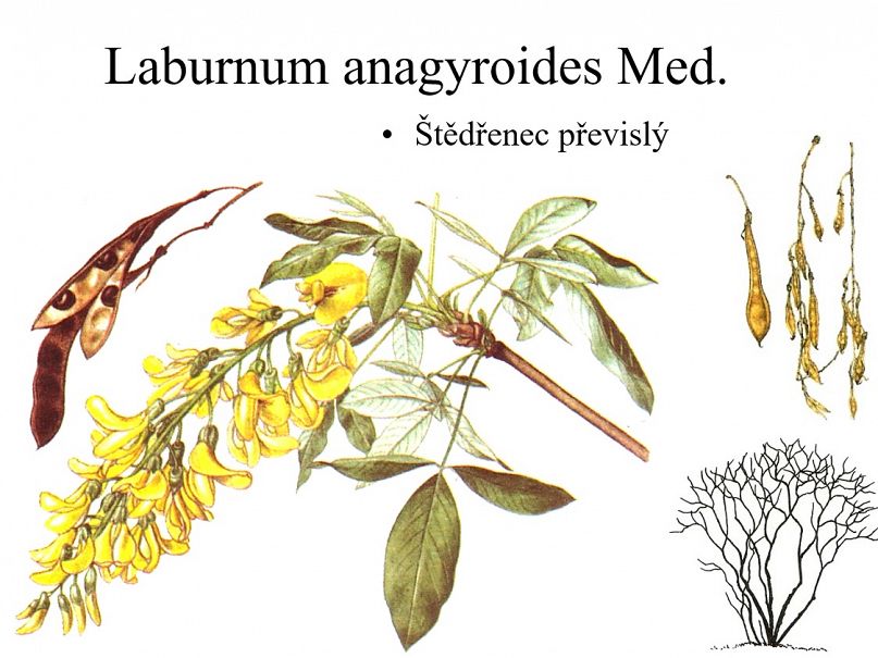 Vypadá jako akát, kvete žlutě, je prudce jedovatý odspodu