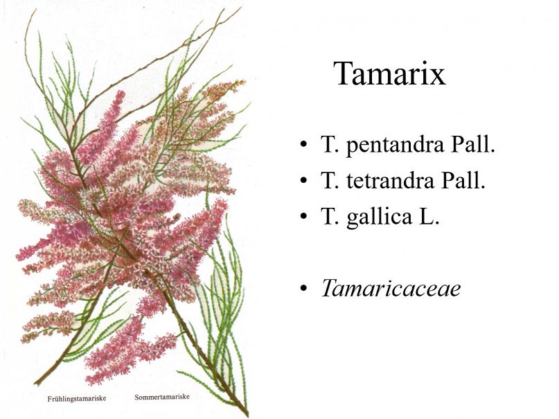 4-5 m vysoký keř s jemnou texturou, kvetou jemně růžově,