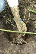 Místo očkování 1 palec nad úrovní země. Když se zasadí hluboko pustí kořeny z roubu což je nežádoucí. Kořeny zakrátím jen o poškozenou část. díra na vysazení musí být dostatečně velká, aby se kořeny neohýbaly. Přihrneme zeminou přišlápneme uděláme mísu na zalévání a zalejeme.