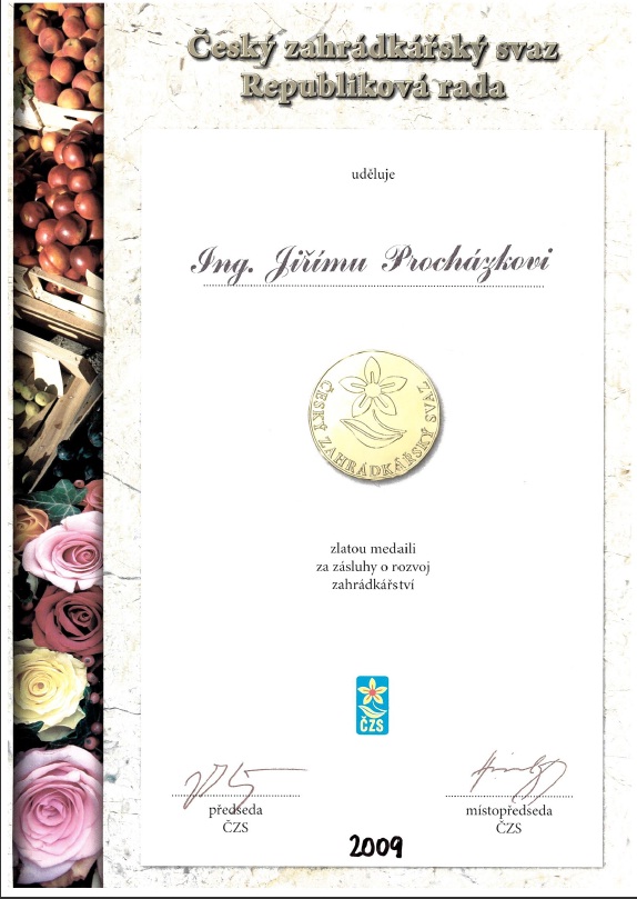 | Stříbrnou medaili | Pavel Šimon za zásluhy o Český zahrádkářský svaz. Byl delegátem ZO v ÚS ČZS Brno-venkov, pečlivě aktualizoval naši vývěsní skříňku a zúčastňoval se aktivně všech akcí ZO. Svou pomocí při pořádání výstav naší ZO i dodáváním vzorků svých výpěstků i na výstavy oblastní přispíval k propagaci naší ZO | |