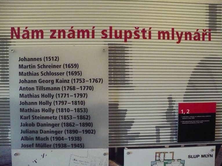 První zpráva o mlynáři ve Slupi pochází z r.1512. Mlýn zde stál nejspíš mnohem dřív. Do současné podoby byl mlýn přestavěn asi koncem 16.století nebo začátkem století 17. Jeho význam však netkví pouze v jeho architektonickém ztvárnění, ale i v souboru nainstalovaných mlýnských zařízení. V letech 1978 až 1983 byly do mlýnice nainstalovány postupně takové mlýnské stroje a zařízení, o jejichž existenci a činnosti se daly získat informace z archivních zpráv. Nešlo o přesnou rekonstrukci původní mlýnské technologie, nýbrž o renovaci zbytků stavebního vybavení. Rekonstrukce strojního vybavení je provedena s ohledem na možnost předvádět chod strojů naprázdno. V mlýnici jsou zabudovány čtyři kompletní a funkční technologické celky reprezentující techniku minulých staletí našich vodních mlýnů: staročeské mlýnské složení, kašník, amerikánské a válcové mlýnské složení.
