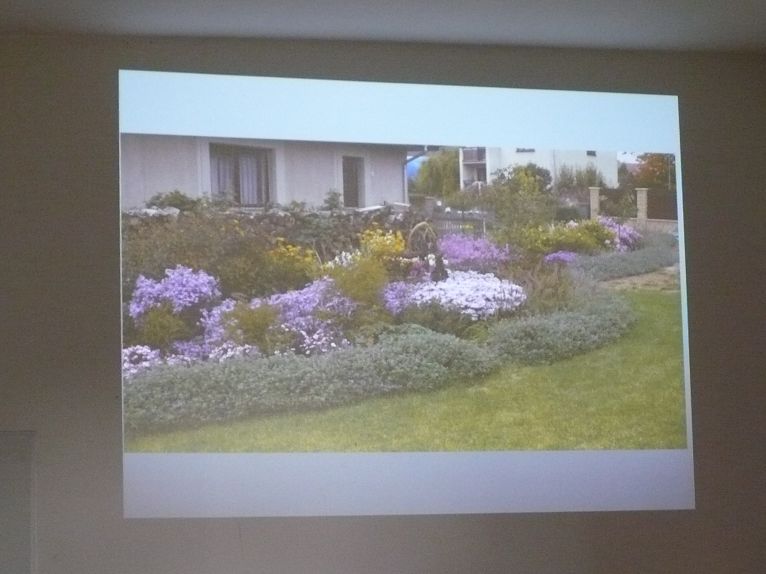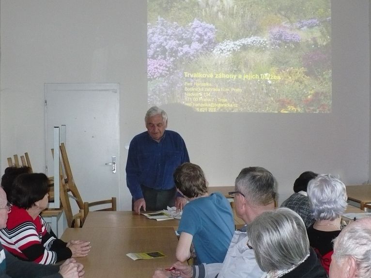 Na bohatém obrazovém materiálu, pořízeném v soukromých zahradách nebo v botanických zahradách nám Ing. Hanzelka představil jednotlivé druhy trvalek, vhodných do různých typů pozemků (na slunci, ve stínu či polostínu, dostatku či nedostatku vláhy). Na přiložených snímcích je vidět záhon před výsadbou a po dvou letech od výsadby.