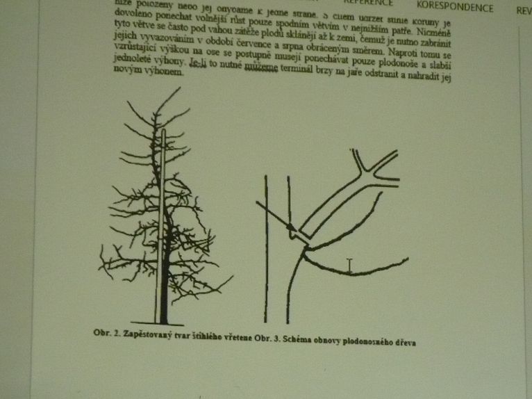 Vývoj vřetene: Každý to provozuje jinak, vřeteno musíte donutit, aby rostlo tak, jak chcete vy – uplatnit vrcholovou dominanci. Zjara zaštípneme vrchol, zaštípneme i boční větve, vyvážeme do vodorovné polohy – tím zbrzdíme růst. S vývojem tvaru nespěchat, nedopustit, aby spodní ramena byla slabá. Zmlazování – obnovu provádíme po 5 letech – řežeme salámovým řezem (šikmo, spodní hrana delší). Případné vlky asi v červenci vyvázat – založíme tak nové rameno