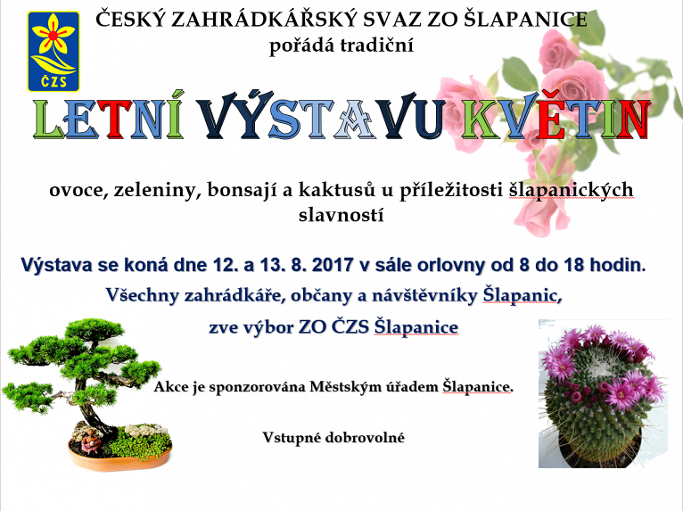 Dne 12. a 13. 8. 2017 uspořádal ČZS ZO Šlapanice u příležitosti šlapanických slavností  již tradiční výstavu letních květin, ovoce, zeleniny, bonsají  a kaktusů. Výstava byla pořádána na orlovně.