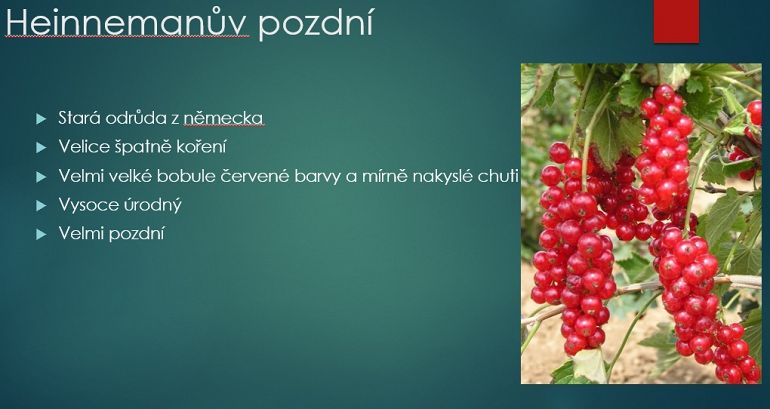Heinemanův pozdní – stará německá odrůda, velmi velké červené bobule, vysoce úrodný, velmi pozdní (2. týden v srpnu)