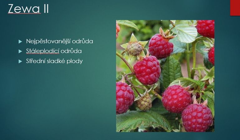 Zewa II – nejpěstovanější, 2x plodící odrůda, střední červené sladké plody