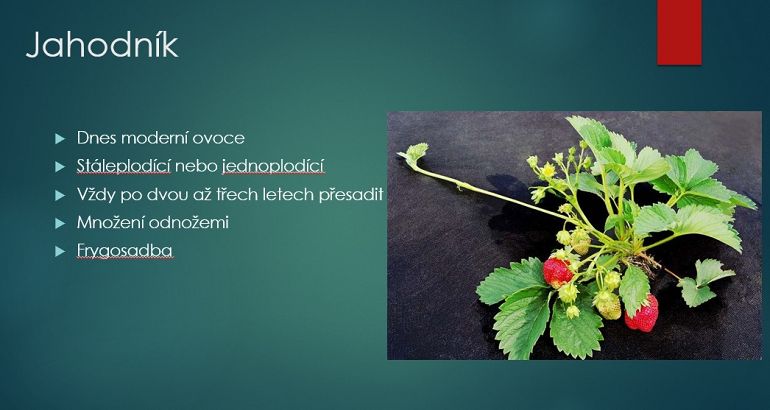 Dle vlastní obrazové prezentace nás seznámil s nejznámějšími druhy drobného ovoce, pěstovaného u nás. Jsou t rybíz, angrešt, maliník, ostružiník, jahodník, kanadská borůvka, zimolez – kamčatská borůvka, růže plodonosná a josta.