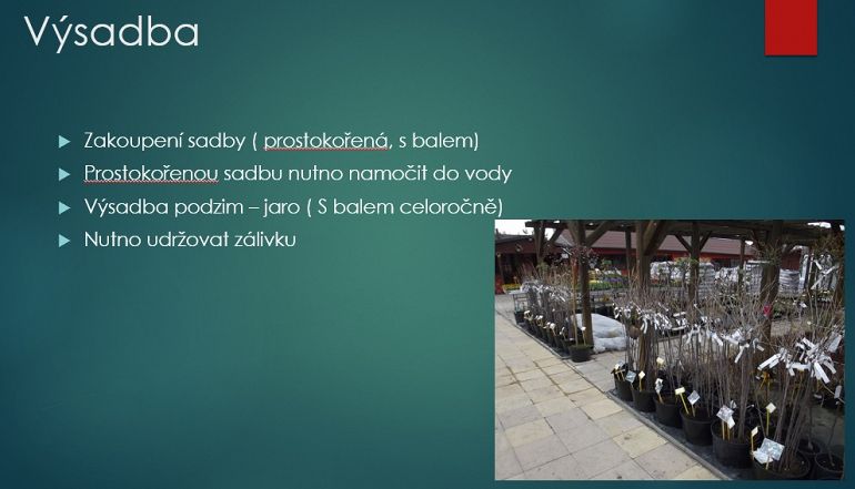 Výsadba - na jaře nebo na podzim, prostokořennou sadbu po zakoupení přes noc nutno namočit do vody, s balem( dražší) lze sázet celoročně. Nutno dodržovat zálivku.