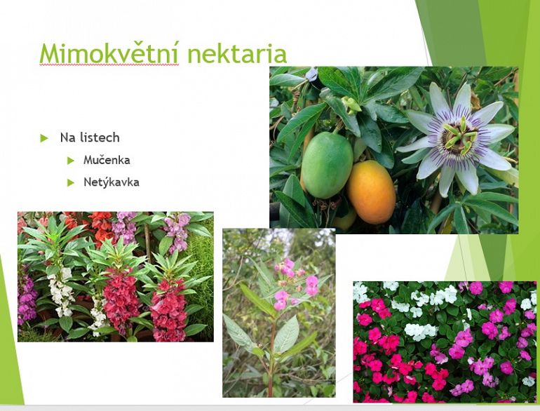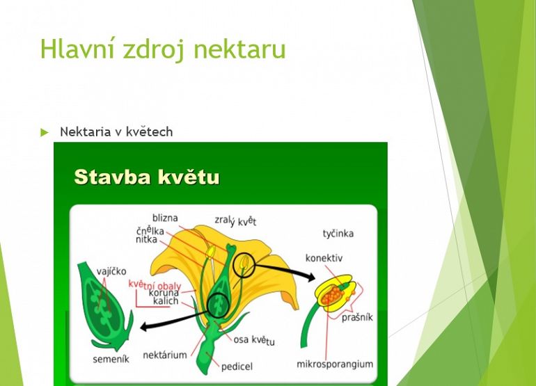 Na obrázku stavby květu nám ukázal, kde se nachází nektarium a mimokvětní  nektária  na listech např. mučenky a netýkavky.  Zdroji medovice jsou i mšice, medovnice smrková, puklice smrková, červec javorový a vlnatka krvavá.