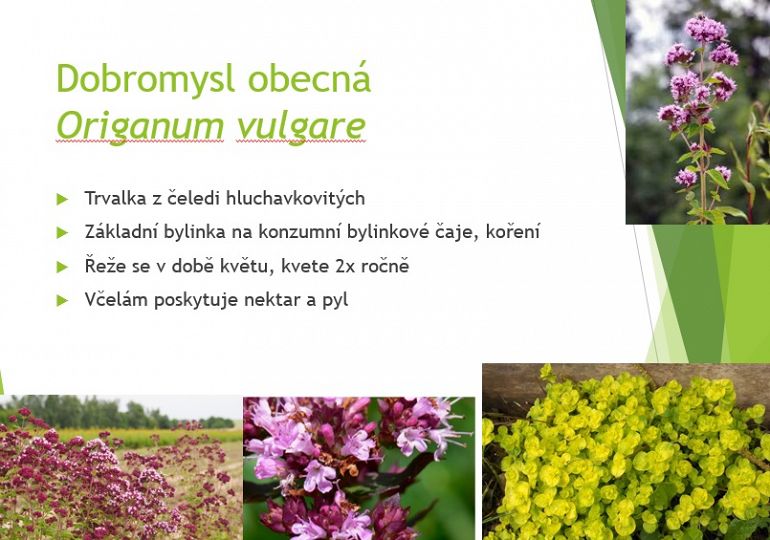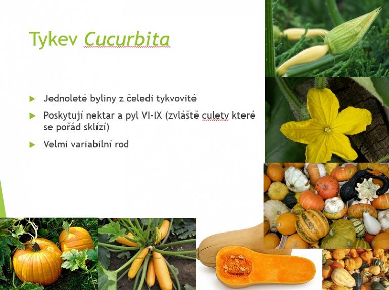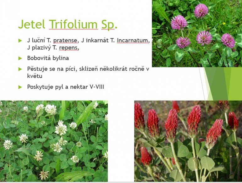 Jetel luční, j. inkarnát, j. plazivý, tolice vojtěška, komonice bílá, vičenec,vika,kukuřice setá,tykev,okurka setá, kmín kořenný, fazol obecný, hrách setý, řepka olejka, slunečnice roční, mák setý, hořčice bílá, dobromysl obecná, máta peprná, tymián obecný, šalvěj lékařská, levandule lékařská,brutnák lékařský,chrpa polní, pohanka.