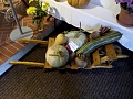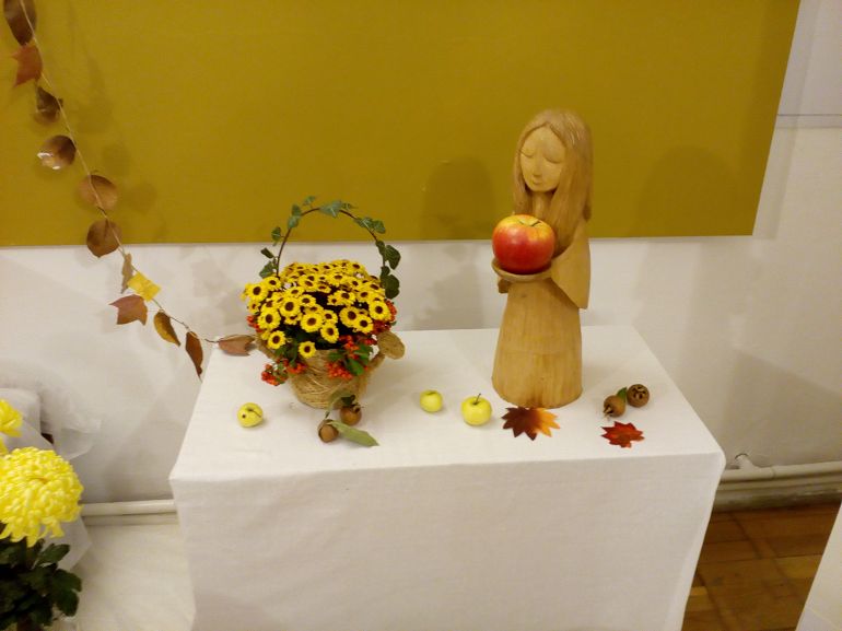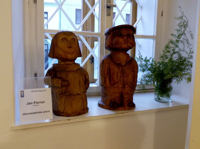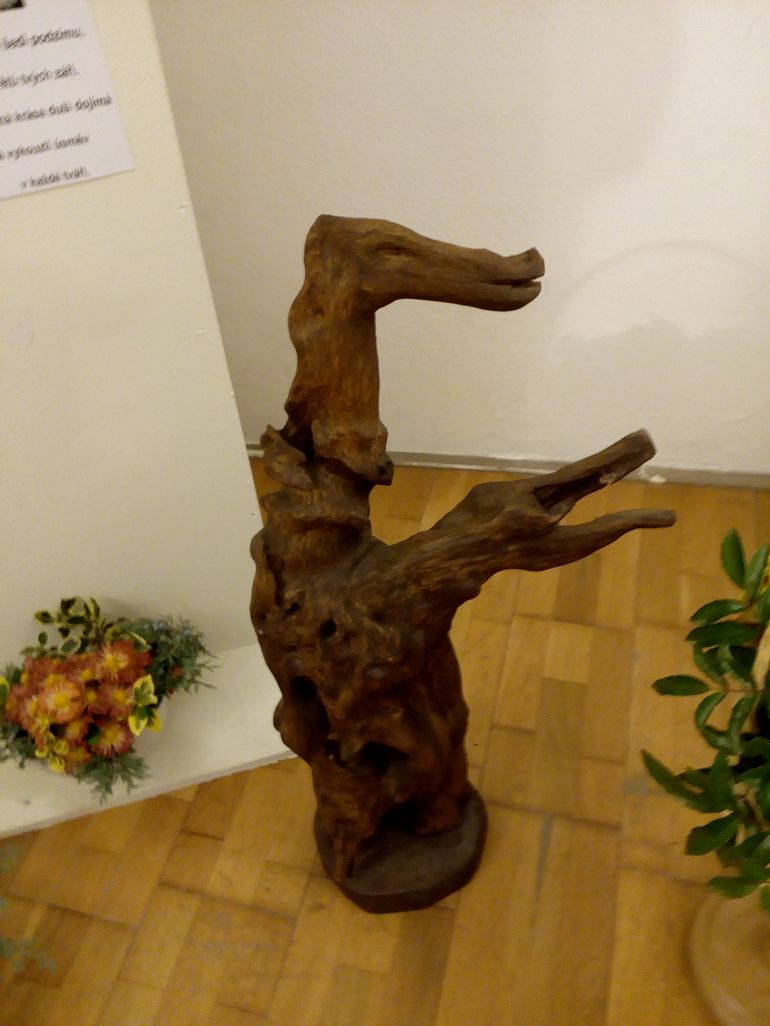 Výstava byla doplněna dřevořezbami, které velice citlivě podmaní krásu podzimních exponátů a také aranžérskými pracemi.