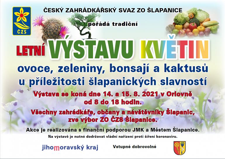 Rok 2021 byl opět ovlivněn virem Covid 19 a tím i opatřeními vlády proti šíření Koronaviru. V létě došlo k mírnějšímu omezení a tak mohla organizace zahrádkářů uspořádat tradiční výstavu letních květin, ovoce, zeleniny, bonsají a kaktusů u příležitosti šlapanických slavností. Letošní rok byl bohatý na srážky a tak jsme měli zajištěný dostatek exponátů.