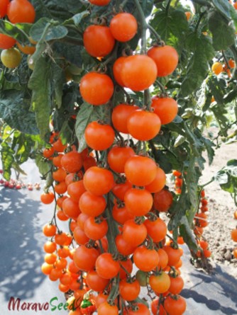 Barva plodu oranžova, hmotnost plodu 40-50 g, nejsladší rajče, snadno praská