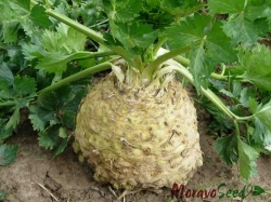 Celer, pro sklizeň na zeleno i skladování, vegetace 120-130 dnů, vysoké pevné listy, bílá barva dužiny, netvoří dutiny nemá boční kořeny a bulvičku plně vytlačenou nad zem