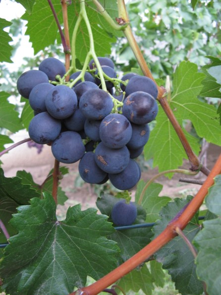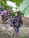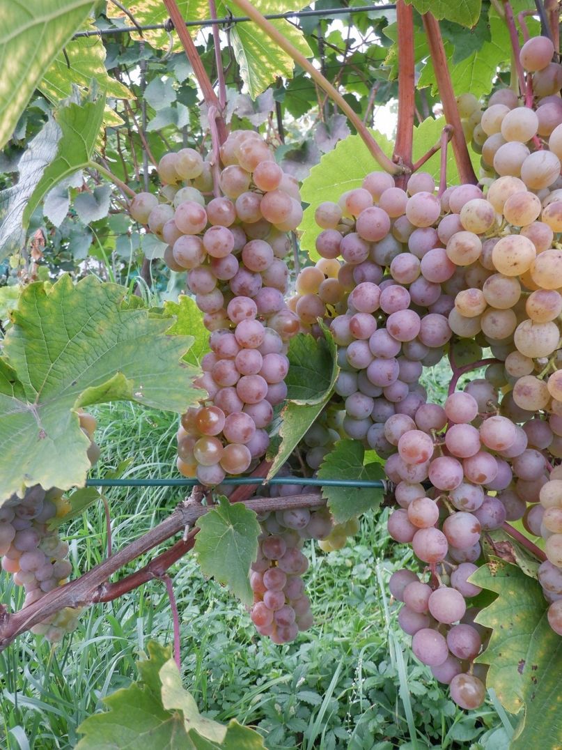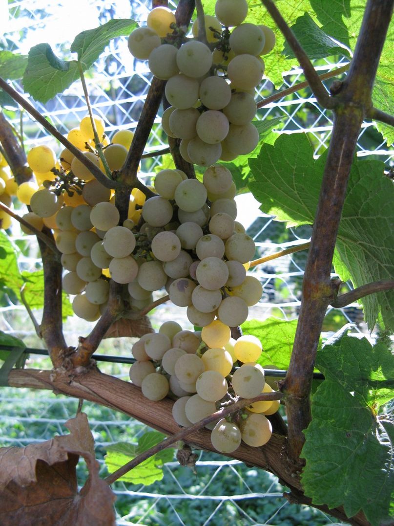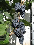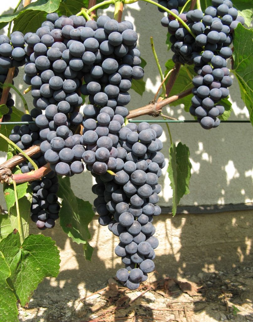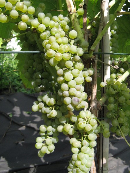 Husté hrozny, dozrává později, bobule 10-12 g bez rudimentů, střední odolnost k plísni révové,