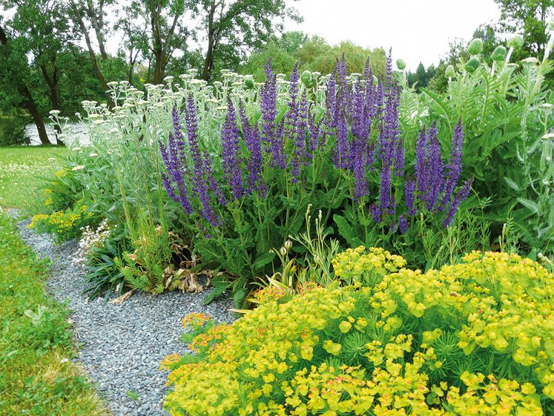 Musí být vysázeno tak nahusto aby v první roce květiny plochu zarostly a neumožnily ji zaplevelit. Ne 1 kytka na m2 protože by mohla být udušena plevely nebo by pletí bylo příliš náročné ale 8-10 exemplářů té stejné rostliny. Na okraj vysazovat nižší rostliny doprostřed nebo ke zdi vyšší. Ošetřování spočívá pouze v zálivce a v předjaří v posečení a odstranění uschlých částí rostlin. Záhon může obsahovat dvouletky např divizny, které se přesévají a rostou v místech kde vypadla jiná rostlina. Záhon se v čase proměňuje a je každý rok jiný. Krátkověké trvalky vydrží 3-5 let středněvěké 5-10 let a dlouhověké vydrží desetiletí